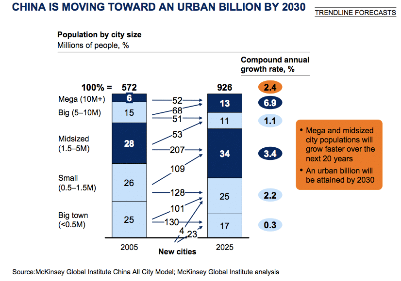 McKinsey “projects that China’s urban population will expand from 572 million in 2005 to 926 million in 2025…by 2030, China’s urban population is on track to reach one billion.” Of those 350 million people, they estimate that more than 240 million will be migrants.