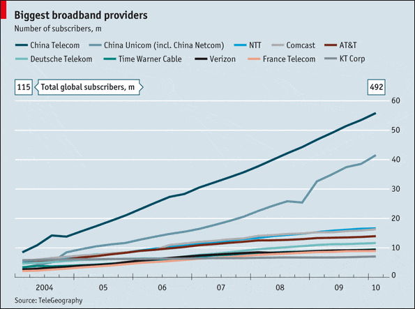 China has the #1 and #2 largest broadband providers in the world. China Telecom and China Unicom together account for a fifth of all global broadband subscribers.