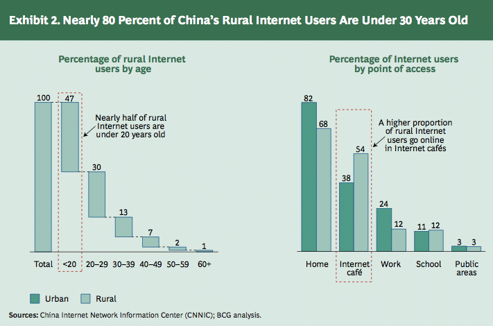 In rural China today, nearly half of all Internet users are under 20 years old. Nearly 80% are under 30.