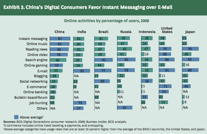 The Chinese prefer IM over email. “One of the most distinctive online habits among Chinese consumers is the tendency to prefer instant messaging (IM) over e-mail. For instance, 87 percent of Chinese digital consumers use the Internet for IM, compared with only 53 percent for e-mail.”