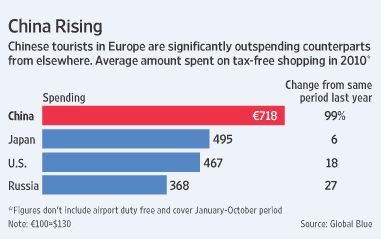 In 2010, Chinese tourists became the world’s top tax-free shoppers in Europe—taking the top spot from Russian tourists. Chinese travelers spent 744 Euros on average, doubling the 368 Euros spent by Russians.